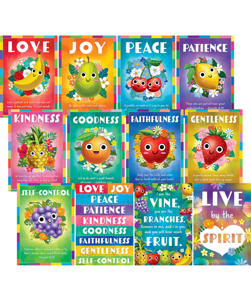 These colorful engaging posters, featuring the Fruit of the Spirit, are perfect for classroom and at-home learning. Displaying vibrant illustrations and insightful teachings, they provide a visually stimulating and educational resource for fostering character development and spiritual growth for classroom and at-home learning. Each poster measures 11" x 15-3/4". Each pack includes 12 posters.