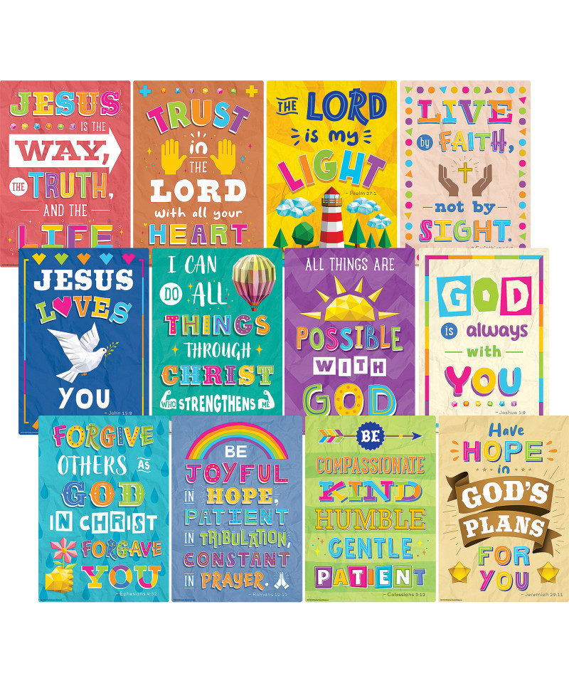 These illuminating Bible verse posters serve as practical tools for both classroom instruction and personal reflection. With captivating designs these posters offer a meaningful way to incorporate faith-based teachings into classroom and at-home learning. Each poster measures 11" x 15-3/4". Each pack includes 12 posters.