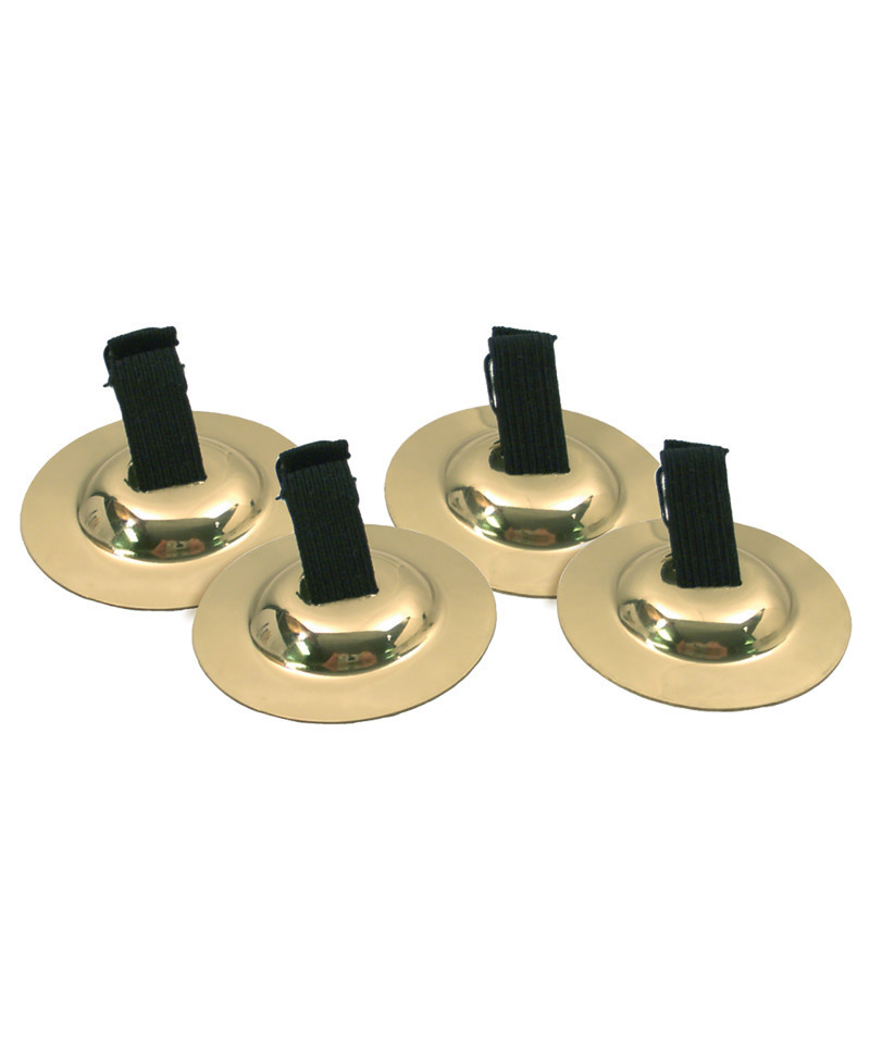 Set of 4 (2 pairs) stamped brass finger cymbals. Each set of 4 finger cymbals weighs 0.14 pounds. The black elastic straps are securely stitched in place while an attached silver buckle on each strap allows for adjustments in the length of the elastic to better fit individual fingers.