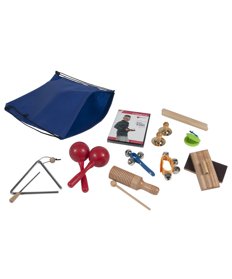 - One Pair of Maracas, One 6" Triangle, One Pair of Sand Blocks, One Guiro Crow Sounder with Mallet, One Pair of 8" Rhythm Sticks, One Cluster Bell, One Finger Castanet, One Pair of Finger Cymbals, One Instructional DVD, One Drawstring Bag