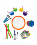 The Colorful Curations Kit contains some of the most popular instruments in fun, bright colors. All of the instruments in this kit are easy to hold and simple to us! All of the instruments in this kit can be easily sanitized between uses. Contains 3 single jingle bells, 5 jumbo egg shakers, two pairs of plastic rhythm sticks, 3 small plastic star tambourines, 4 plastic finger castanets, 1 plastic guiro shaker with striker, and one plastic frame drum with mallet.