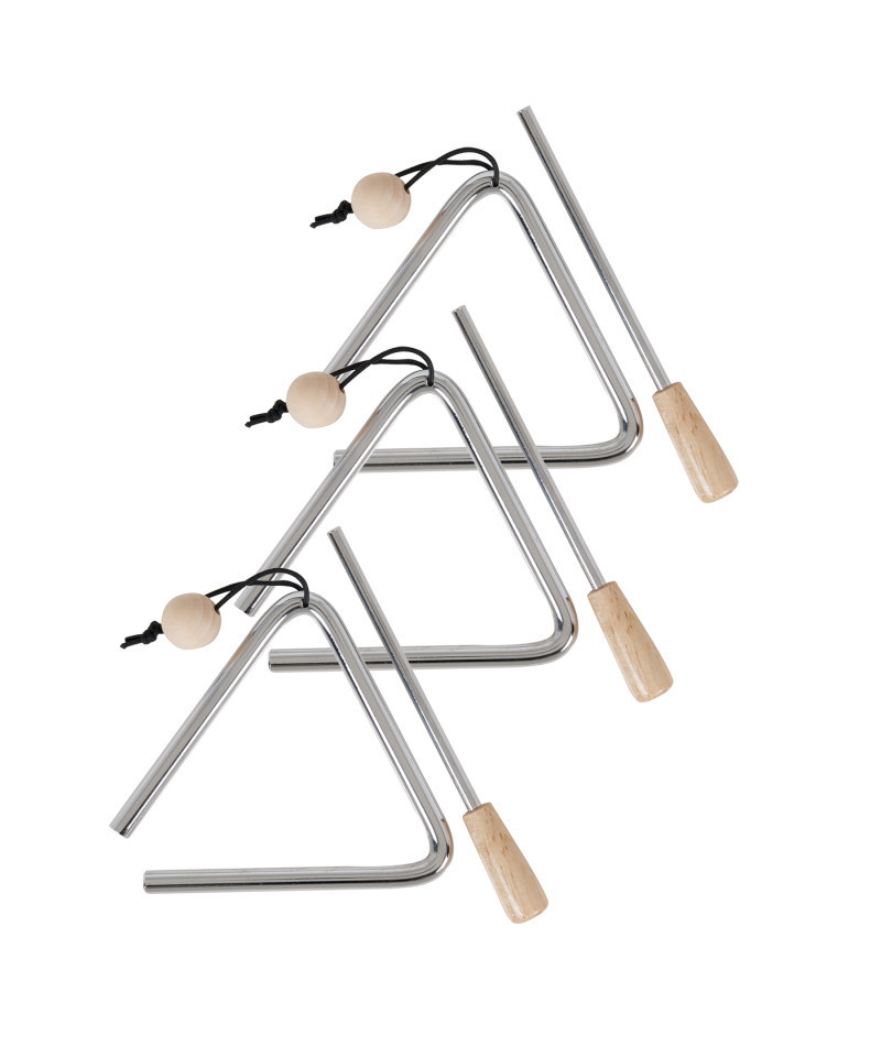 These steel triangles produce a beautiful, high pitched ringing tone. With an easy-to-hold wood handle, these triangles are constructed to allow for maximum vibration. A beater is included. Holder attached through hole in triangle. Sold as a pack of 3 triangles, each with beater.