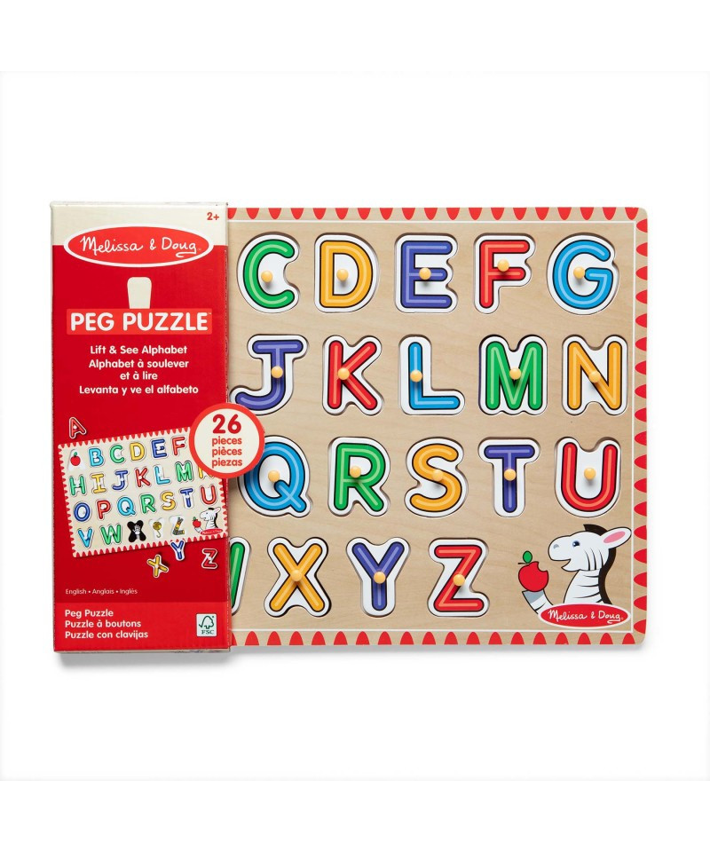 - 26-piece wooden alphabet peg puzzle