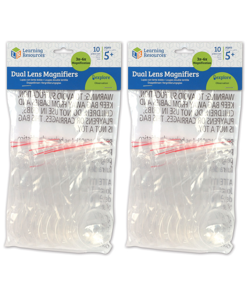 Each pack includes 10 versatile plastic magnifiers (1.75" diameter) featuring 3x and 6x magnifications. For ages 5 and up. Sold as 2 packs for a total of 20 magnifiers.