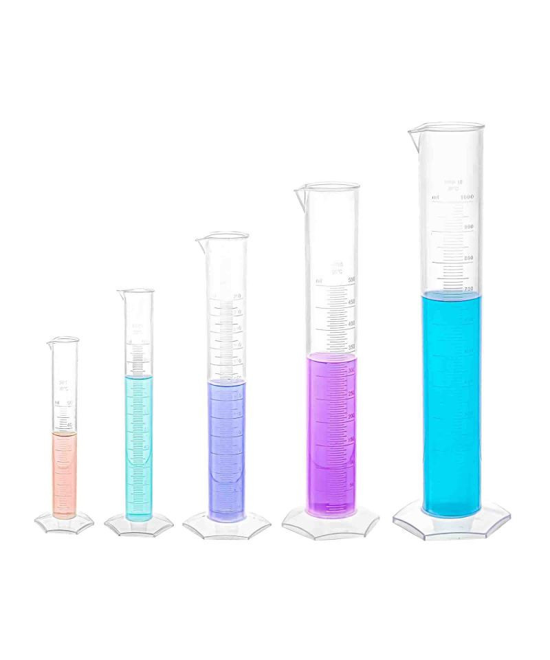 These 5 molded graduated cylinders are perfect for your experiments! The hexagonal base provides excellent stability to the cylinders. The tapered spout works well while pouring any reagent. Measurements come in 50, 100, 250, 500,1000ml and made of opaque polypropylene.