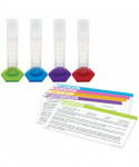 Inspire young scientists to pour, measure, and explore the wonders of the natural world! The Graduated Cylinders Activity Set makes science fun with hands-on activities that encourage experimentation, observation, and analysis. Use the five provided double-sided activity cards to ask observation questions, introduce basic scientific concepts, and perform simple experiments using common household and classroom materials. Perfect for stations or independent exploration. Each of the 4 clear cylinders is approximately 7" tall, 1-1/4" in diameter, and can hold 100mL of liquid (measured in increments of 10mL). The cylinder bases come in 4 different colors and have a diameter of 2-3/4" at the widest points. Ages 3+