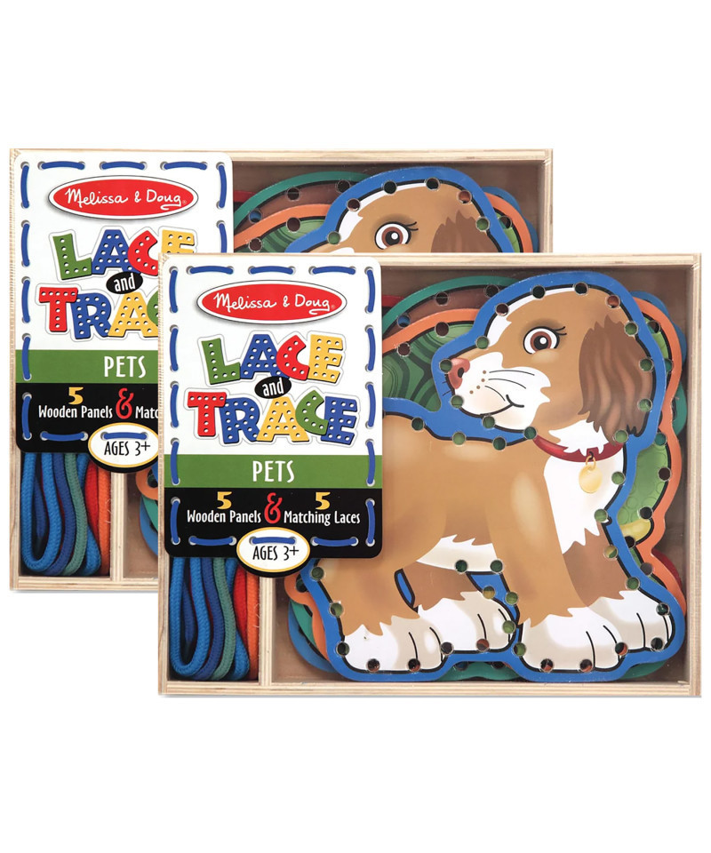 With adorable pets pictured on both sides, it's fun to practice lacing and tracing skills. This wooden set contains five sturdy, double-sided lacing panels, plus five color-coordinated laces! Develop hand-eye coordination and attention skills with this great activity. Each set includes 5 double-sided, wooden animals with 5 color-coordinated laces. Sold as a pack of 2 identical sets.