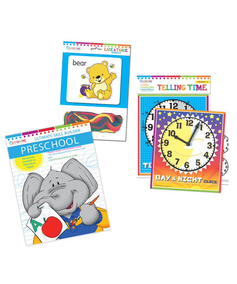 This Preschool Learning Bundle is an ideal all-in-one resource for preparing young children for school with engaging, hands-on activities. The Preschool Ultimate Skill Builders Workbook provides a comprehensive range of early academic skills, from numbers and shapes to letters, letter sounds, rhyming, tracing, and more. With 320 black-and-white pages, an answer key, and permission to reproduce, it's perfect for repeated practice. The Telling Time Clocks set includes a "Day and Night" Clock and a "Teaching" Clock, guiding children in learning time concepts from the hour to the minute. Finally, the Lace & Trace Animals set encourages fine motor skill development with 8 adorable animal cards and plastic-tipped laces, which double as stencils for creative play.