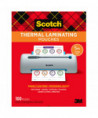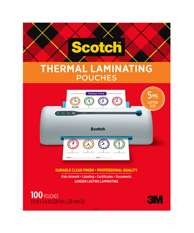 Scotch™ Thermal Laminating Pouches protect items from damage and are for use with thermal laminators. These 5 mil thicker pouches are great for a very sturdy and more durable finish. Protects and adds professionalism to business documents. Great for signs, flyers, schedules, certificates, to-do lists, and other frequently used documents. Ultra clear to let important information show through. Ideal for marker-proof, tear-proof and spill-proof paper items that you want to last in the home, office or classroom. Recommended to use with Scotch™ Thermal Laminators. Letter Size, for items up to 8.5 in. x 11.4 in. Pack of 100. 5mil.