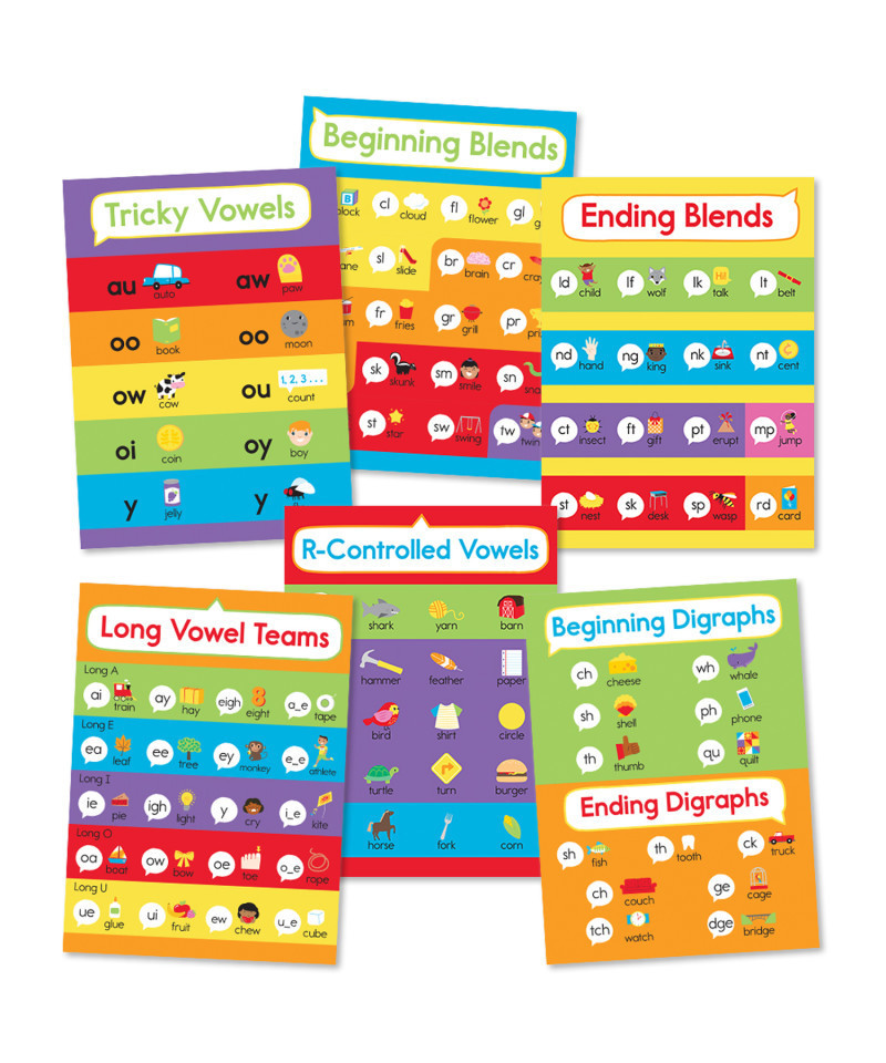 The Phonics Bulletin Board Set includes 6 charts that cover long vowel teams, tricky vowels, beginning and ending blends, beginning and ending digraphs, and r-controlled vowels. Each chart measures 17" x 23".