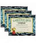 Language Arts Achievement Certificate are given to students who are working hard and excelling in class. This Hayes certificate is designed with a black and blue linear gradient. The background features different words associated with language arts class. These language arts awards are great to give out at end of the school year parties and award ceremonies. Certificates measure 8.5" x 11". Each pack includes 30 certificates. Sold as 3 packs for a total of 90 certificates.