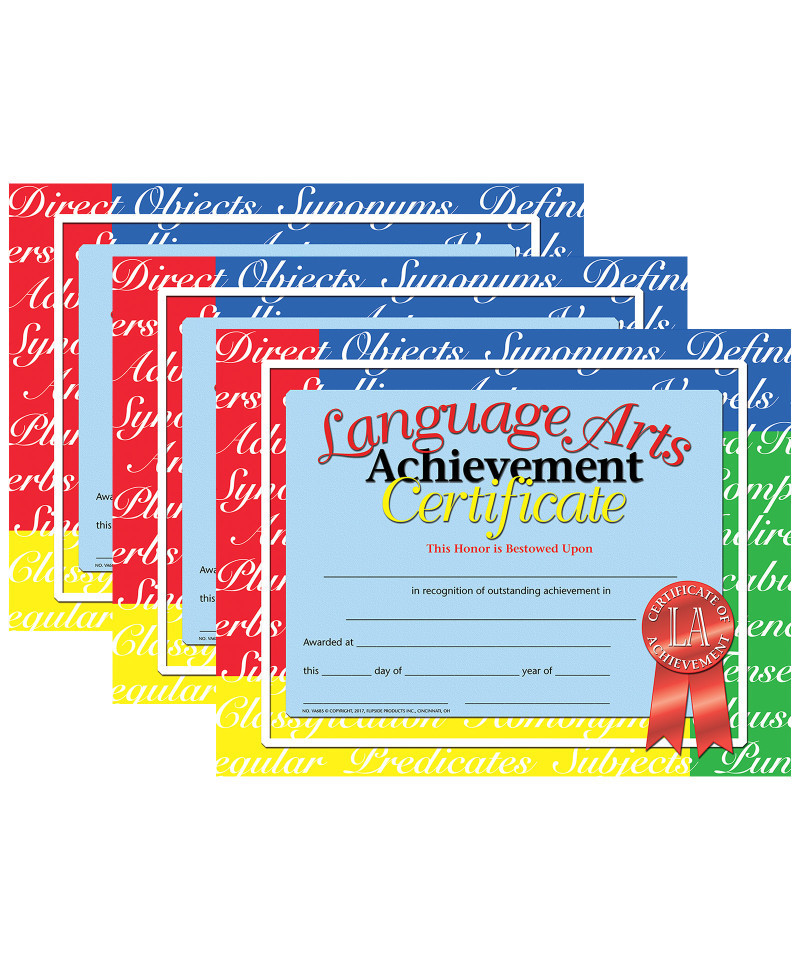 Certificate reads: Language Arts Achievement Certificate This Honor is Bestowed Upon _____ in recognition of outstanding achievement in _____ Awarded at _____ this _____ day of _____ year of _____.