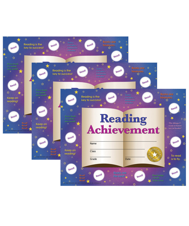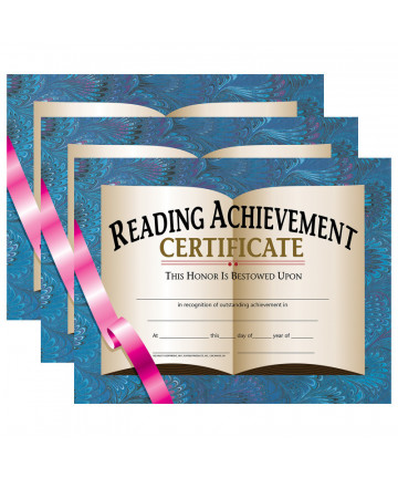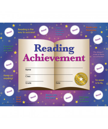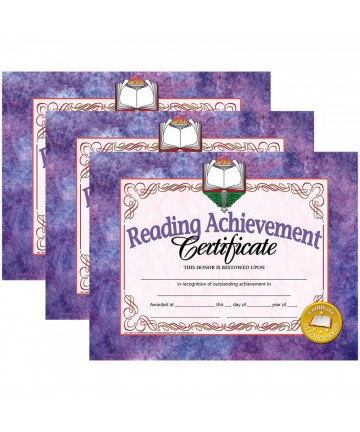 Reading Achievement Certificates and Reward Seals Combination Pack are a great way to promote reading among students. These student certificates are beautifully designed and they are printed in full color on high quality matte paper. Stick-to-it certificates are great motivators because students get to keep track of their progress and have a goal to work towards. The certificates can be personalized with our downloadable template. They can be printed or handwritten. Certificates are inkjet and laser printer friendly. Certificates measure 8.5" x 11". Each pack includes 30 certificates, 320 reward seals, and an instructor's guide. Sold as 3 packs for a total of 90 certificates and 960 reward seals.