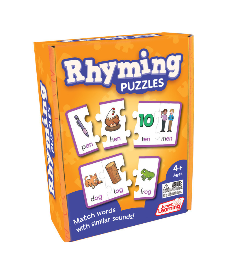This 71 piece puzzle set includes 24 puzzles for matching common rhyming words. Supports the development of phonemic awareness. The rhyming part of the word has been highlighted to support learning. Unique puzzle cut ensures the correct answer and lets students self-correct. For ages 4+.