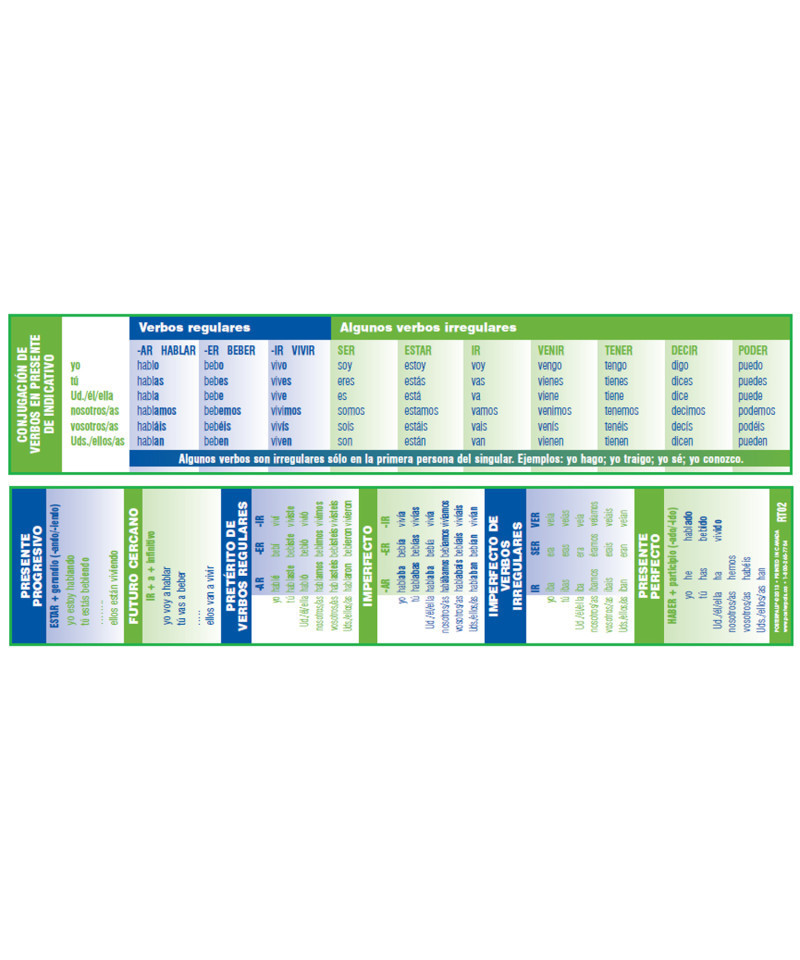 A Spanish verb guide at your student's fingertips. A handy reference for the following: present tense of regular verbs ER, IR, AR, irregular verbs SER, ESTAR, IR, VENIR, TENER, DECIR, PODER. Printed on both sides. Laminated. Includes 32 per pack, each 6 3/8" x 1 1/4".