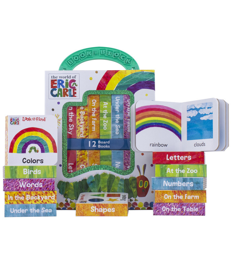 Look, find, and learn with the Very Hungry Caterpillar! This take-along library includes 12 sturdy little board books featuring classic Eric Carle art. Six "Look and Find" titles let little ones search the pages for hidden objects. Six "Here, There, and Everywhere" titles explore concepts like numbers, letters, colors, and shapes. It's a perfect first reading experience for little ones who are "hungry" for fun!