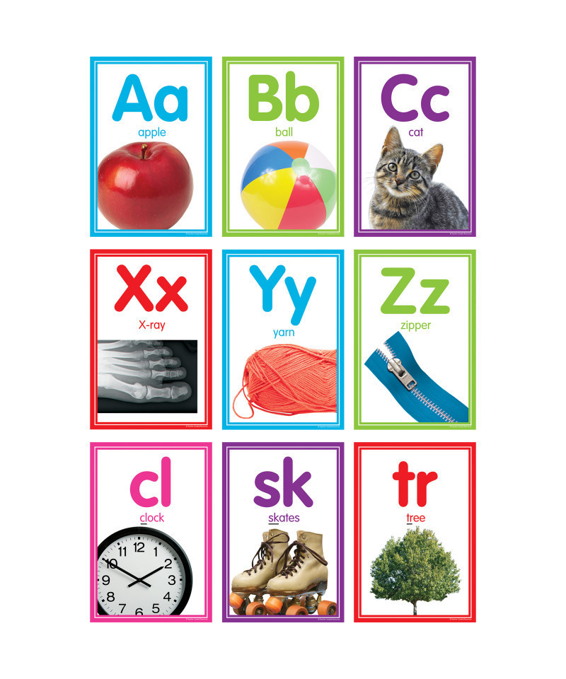 Each alphabet card shows the letter in upper- and lowercase as well as a real photo of an object that starts with that letter and the word for that object spelled out. The 14 blends cards include the blend, a photo of an object that starts with that blend, and the word spelled out with the blend underlined to help reinforce language development skills. Each card measures 5-3/4" x 8-1/2". 40 total pieces.