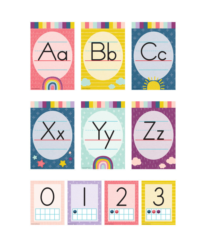 The eye-catching colors and lively designs of this bulletin board will make learning the alphabet fun! Alphabet cards measure 5-1/2" x 8-1/2" and number cards 0-10 measure 4-1/4" x 5-1/2". 37 total pieces.
