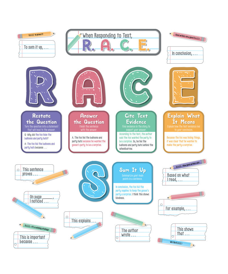 Turn your bulletin boards and visual displays into writing fun with Carson Dellosa's R.A.C.E. Writing Strategy Bulletin Board Set! The 37-piece bulletin board bundle provides visual reinforcement to teach and strengthen students' constructed written responses to what they are reading, with a reference that teaches and reinforces the R.A.C.E. (S) strategy. The set includes a 2-piece header and 5 letters (R, A, C, E, and S). The set also includes 5 informational charts, 5 motivational phrase pencils, 13 sentences starters, and 7 blank pencil cutouts. The set includes explanations and sentence stems for each letter of the R.A.C.E. strategy and includes an S (for Summarize) if you teach it. Made from durable material, this set is perfect for decorating bulletin boards, chalkboards, wall displays, and more to create fun, visual references in and out of the classroom year-round. Education happens everywhere, and Carson Dellosa strives to provide the tools needed to inspire learning everywhere it happens.