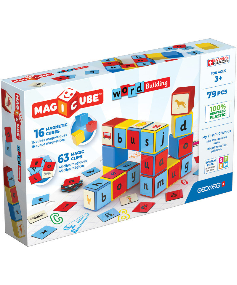 Watch your toddler learn and begin to distinguish letters, build their first words and match to an image. Children will also have the ability to build different shapes, color combinations and 3D structures using Geomag Magicube Word Building 79 pieces that are uniquely designed to connect on all sides and made with 100% recycled plastic. This set contains 16 magnetic blocks and 63 non-magnetic clips. STEM.org authenticated, Magicubes help in the development of creativity, fine motor skills in addition to stimulating imaginative play and curiosity through the science of magnetic construction. Includes 16 magnetic blocks in green, blue, red and yellow, and 63 magiclips (not magnetic) that stick to the magnetic Magicube.
