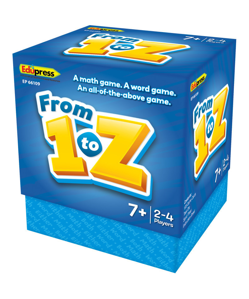 From 1 to Z is a card game and a learning tool all in one. Just roll the die and go! Each side of the foam task die features one of these challenge words: Math, Word, Either, Both. Depending on the task, players use their cards to make a math equation, spell a word, do either, or do both.