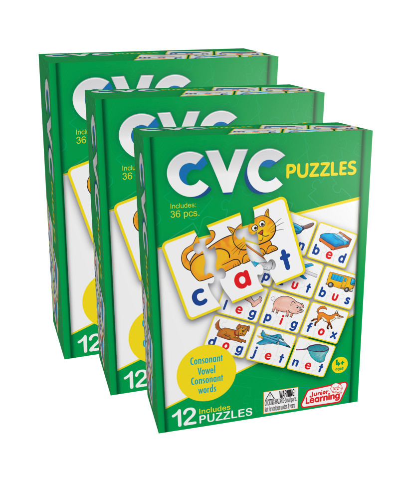 This CVC self-correcting puzzle set is ideal for teaching children consonant vowel consonant patterns and building words. Children can piece together consonant, vowel and consonant pieces to create a completed word with a matching picture. Ages 4+ Each set includes 12 puzzles (36 pieces). Sold as 3 sets for a total of 36 puzzles.