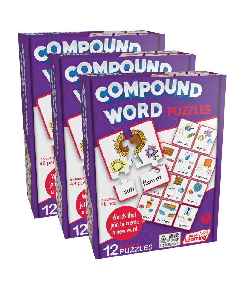 Compound words are 2 separate words that can be joined together to create a new word with a new meaning (such as sun and flower creating sunflower). Piece together the words that can be conjoined with their matching pictures in this self-correcting puzzle, to create a completed card. Ages 5+. Each set includes 12 puzzles (48 pieces). Sold as 3 sets for a total of 36 puzzles.
