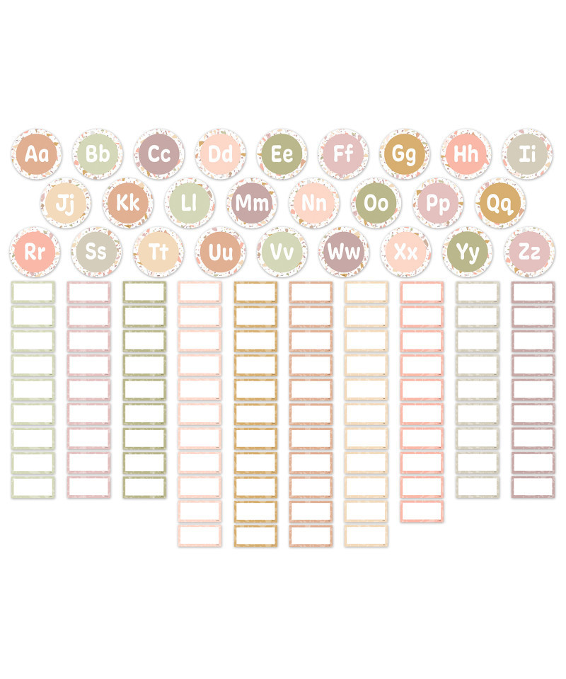 Curate your very own word wall to help students learn the words they need most. This classic terrazzo designed bulletin board features 26 alphabet cards with both upper- and lower-case letters. Also includes 99 blank cards to customize and bring words to life in style and substance! Alphabet cards measure 5-1/4" circles and blank cards measure 4-1/2" x 2-1/4". 125 total pieces.