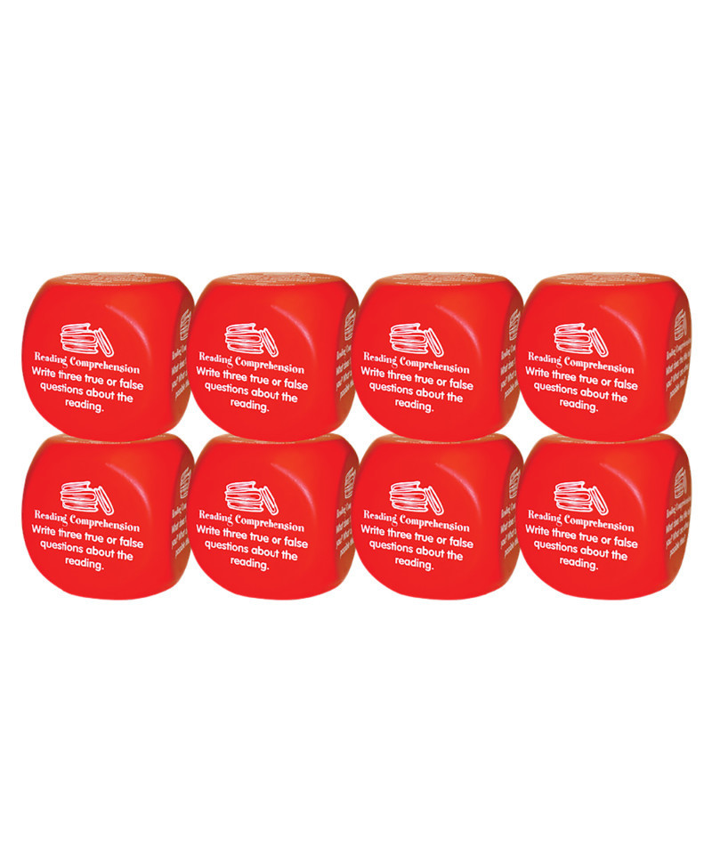 After reading any piece, students spin the cube and perform the selected activity to help boost understanding and retention. Squishably soft and quiet-to-roll foam cube measures 3 inches. Each side has a different question. Questions are not story specific, so they can be used with any story. Set of 8 cubes.
