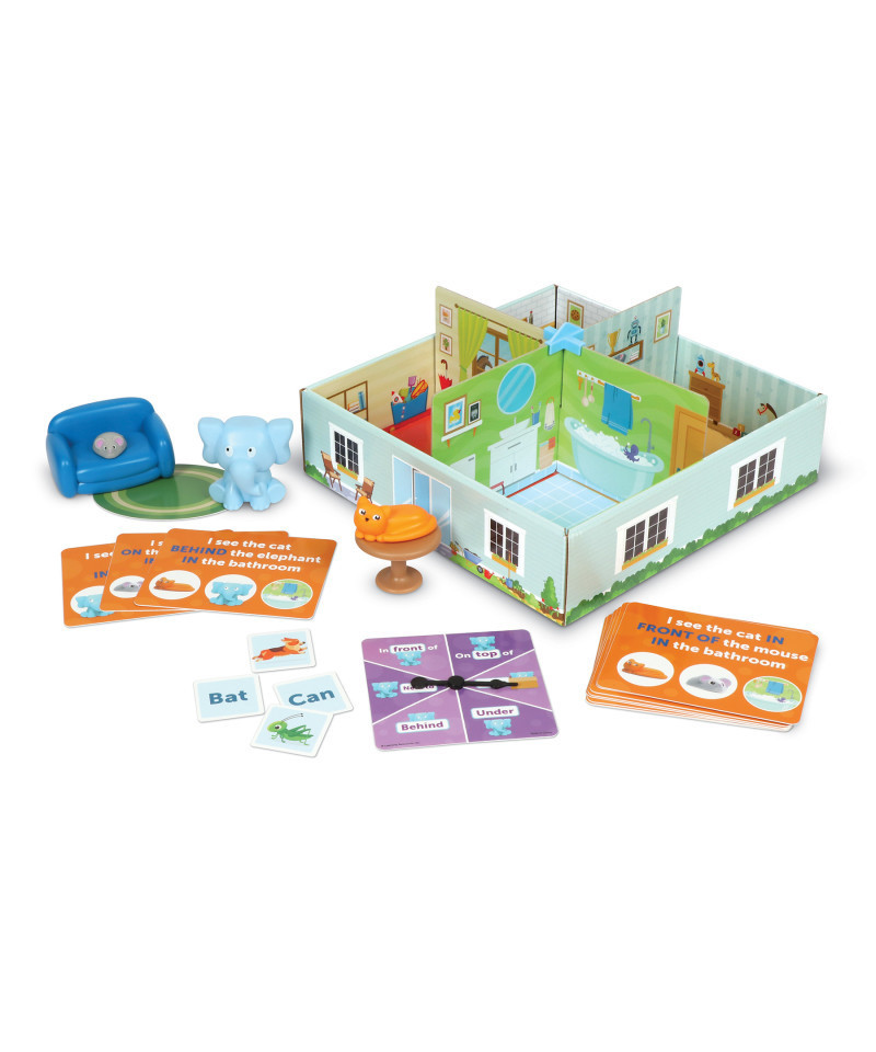 An elephant never forgets this fun way to learn positional words! Draw a challenge card or twirl the spinner, then follow the directions to position the animal figures in one of four rooms. Guide includes activities involving positional words, multi-step directions, spatial awareness, the alphabet, and more! Removable slotted walls allow for out-of-the-box play!