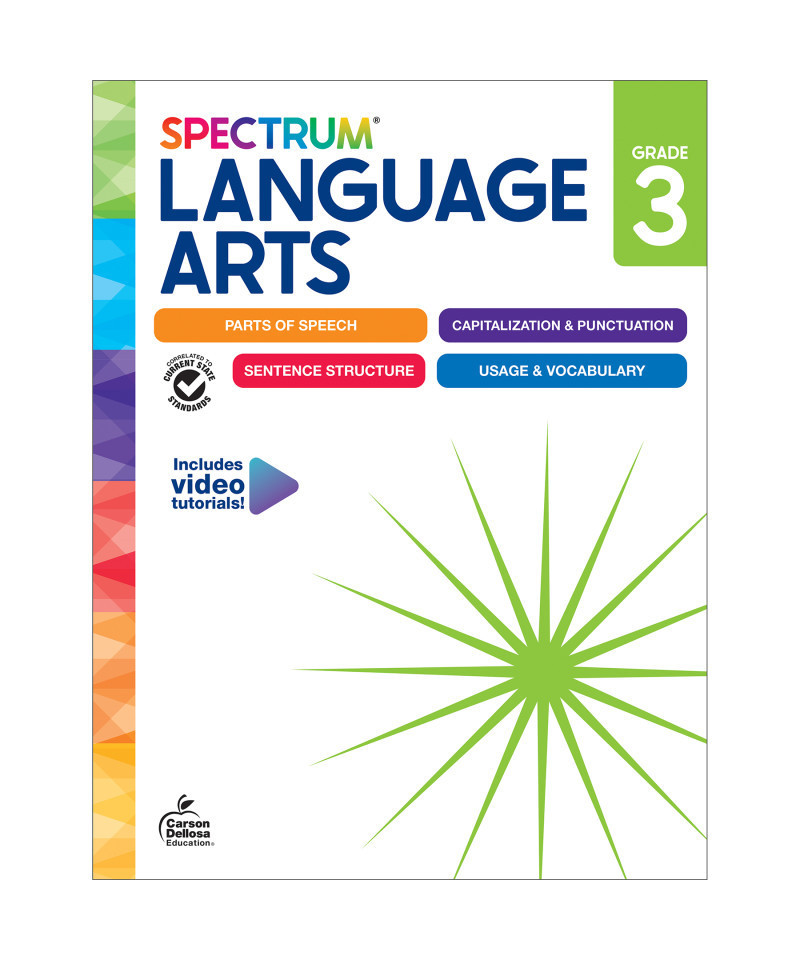 Support your child's language arts learning journey with Spectrum Language Arts 3rd Grade Workbooks! The Spectrum Grade 3 Language Arts Workbook is a great way for your third grader to learn basic ELA and phonics skills such as parts of speech, vocabulary, sentence structure, English grammar, capitalization, and more through a variety of activities that are perfect for both classroom and homeschool curriculum. QR codes are also included throughout the language arts workbook that take you to free video tutorials to help explain and break down certain concepts. Lesson reviews are included to test your child's knowledge along the way. The 192-page 3rd grade workbook is sized at about 8" x 11"—giving your child plenty of space to complete each exercise. Aligned to current state standards, this workbook includes an answer key and a supplemental Writer's Guide to reinforce grammar and language arts concepts. Parent support pages are included at the beginning of each chapter with helpful definitions, tools and tips, and a skills list to provide a spectrum of support for your leaner. An answer key is also included.