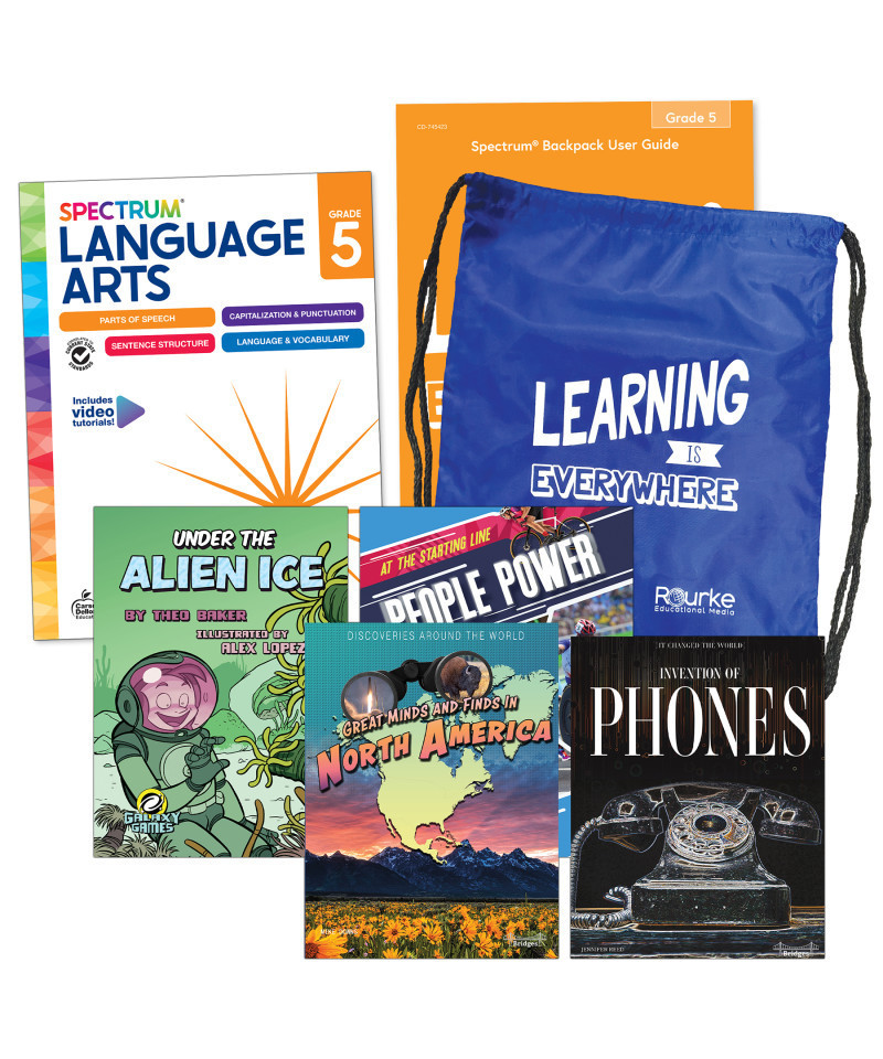 Provide a spectrum of literacy support for your 5th grade student with the Spectrum Grade 5 Language and Literacy Backpack! This ELA & Reading Comprehension Grade 5 Bundle features four 5th grade reading books and a language arts workbook. The English grammar workbook features parent support pages at the beginning of each chapter with helpful definitions, tools and tips, and a skills list to provide a spectrum of support for your leaner. QR codes are also included throughout the language arts workbook that take you to free video tutorials to help explain and break down certain concepts. An answer key is included in the back of the workbook to track your child's progress and accuracy. The bundle of chapter books for 5th graders features both nonfiction and fiction children's books for a variety of reading opportunities. The bundle is stored securely in the durable drawstring bag so your child can read and practice skills while on the go!