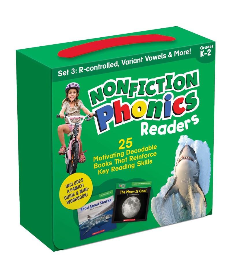 Give your child the tools to become a successful reader with this big, 25-book collection of titles that target must-know concepts: r-control vowels, variant vowels, diphthongs, and more. Each title features clear photos, just-right decodable text, and lively real-world topics such as birds, sharks, sports, forest life, the moon, seasons, and so many more. Includes a caregiver guide and mini-workbook to reinforce learning.