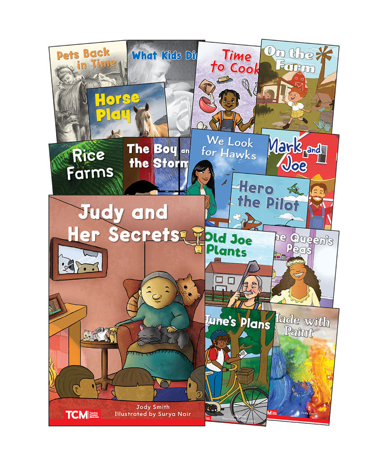 This fun and memorable first-grade set includes sequenced decodable books, #16–#30. The books introduce early readers to new sounds and progressively develop phonological awareness, phonics knowledge, and high-frequency word recognition. Five books in this set are text-first books, offering decoding practice without illustrated clues first, then the text is repeated on the next spread with pictures. Each book includes a helpful family engagement page plus the phonics focus and high-frequency words learned. This set aligns with the Science of Reading and Structured Literacy. This 15-book set includes: Judy and Her Secrets, June's Plan, Made with Paint, Old Joe Plants, The Queen's Peas, Hero the Pilot, Rice Farms, The Boy and the Storm, We Look for Hawks, Mark and Joe, Horse Play, Pets Back in Time, What Kids Did, Time to Cook, and On the Farm.
