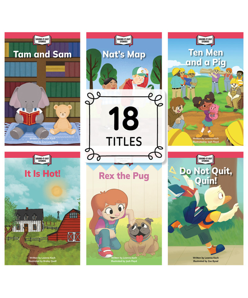 The books in the Sound-It-Out Stories Decodable Readers series provide practice in the phonics skills that equip young readers to unlock unfamiliar words, improve reading accuracy, gain reading confidence, and read independently. Each book focuses on specific phonics patterns in the context of a fun story. Books in the series are in sequential order, from simplest to more complex, beginning with just a few skills and then including previously mastered skills. Readers are encouraged to sound out the words using letter-sound decoding strategies to experience reading success. This 18-book set comes with the following titles: Tam and Sam, Nat's Map, Ten Men and a Pig, It Is Hot!, Rex the Pug, Do Not Quit, Quin!, The Fun Club, The Pet Shop, The Mare of the Lake, The Bike Race, A Whale in the Cove, June's Trick Mules, A Day on the Bay, We Planted a Feast!, Glasses in the Snow, Red Bats, Fern's Fort, Let's Gaze at Stars. Books measure 6" x 9". Each book includes 16 pages.