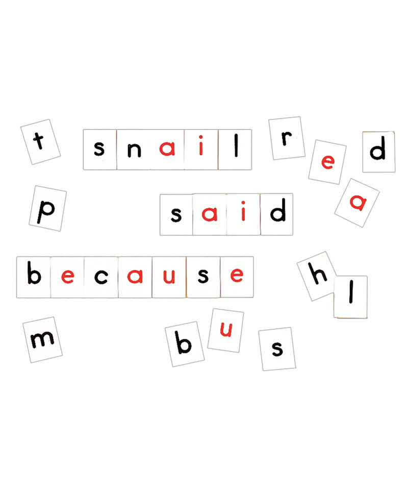 Set of 45 lowercase, plastic letter tiles, red vowels and black consonants, in a handy ziplock bag. Red vowels and black consonants. Includes 2 each of 19 high-frequency letters. 45 tiles