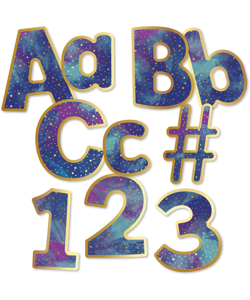 Create attention-grabbing displays with the Galaxy Combo Pack EZ Letters. This 219-piece pre-punched set features rich colors and a shining gold border. This combo pack includes these 4-inch characters:• 70 uppercase letters
