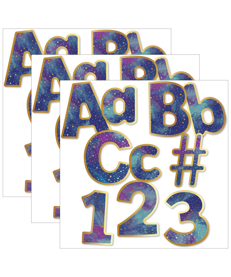 Create attention-grabbing displays with the Galaxy 4" EZ Letters Combo Pack. All characters feature a shining gold border and vibrant colors to help your message stand out! Take your displays from dull to dazzling with Carson-Dellosa's EZ Letters. These letters add an energetic touch to any classroom, and you can use them for any grade. Make sure to view other Galaxy products to create a cohesive classroom theme. This 219-piece pre-punched set includes these characters: 70 uppercase letters, 87 lowercase letters, 20 numbers, 20 punctuation marks, and 22 symbols. Sold as 3 packs for a total of 657 pieces.