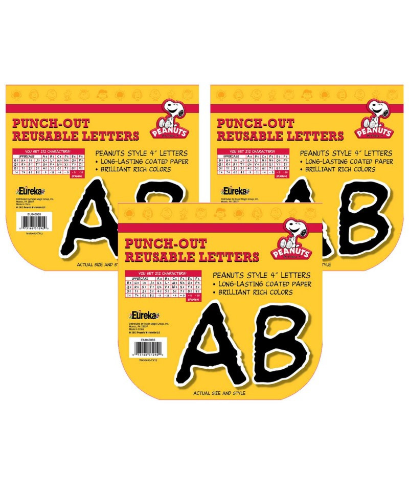 Try Eureka Reusable Punch Out Letters. Printed on coated paper with brilliant rich color, they are perfect for creating personalized projects in displays. Reusable 4" letters printed on coated paper using the very recognizable Peanuts font. Each pack contains 212 characters. Sold as 3 packs for 636 characters total.