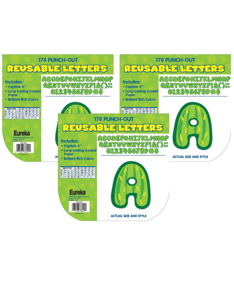 An easy way to create personalized classroom messages on bulletin boards, windows, chalkboards and hallways. Each punch-out, reusable letter is printed on long-lasting coated paper in brilliant, rich colors. Individual letters each measure 4". Coordinates with the A Sharp Bunch collection. Each set includes 178 characters. Sold as 3 packs for a total of 534 characters.