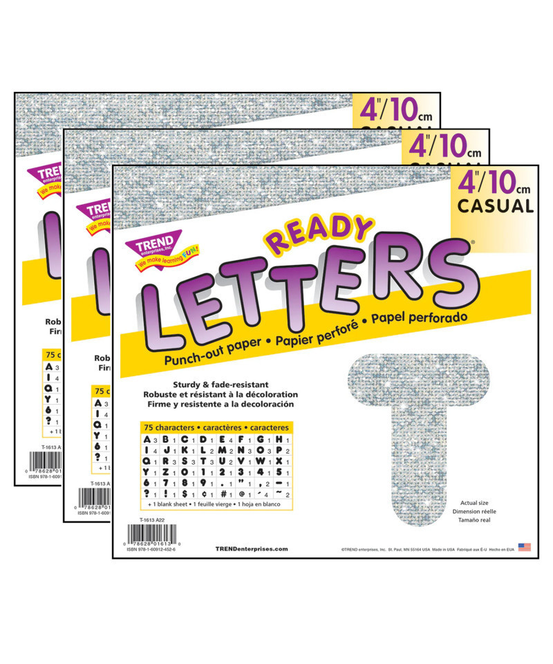 Lively letters, limitless possibilities! Convenient, reusable, and easy to use. Great for student work displays, bulletin boards, signs, banners, news boards, learning activities, labeling, and much more! Fade-resistant colors coordinate with TREND products. Durable. Each pack includes 50 uppercase letters, 10 numerals 0-9, 11 punctuation marks, and 1 blank sheet. Sold as 3 packs.