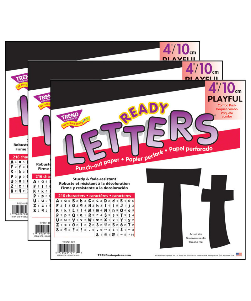 Lively letters, limitless possibilities! Convenient, reusable, and easy to use. Great for student work displays, bulletin boards, signs, banners, news boards, learning activities, labeling, and much more! Fade-resistant colors coordinate with TREND products. Durable. Each pack includes 59 uppercase letters, 84 lowercase letters, 20 numerals 0-9, 35 punctuation marks, and 18 Spanish accent marks. Sold as 3 packs.