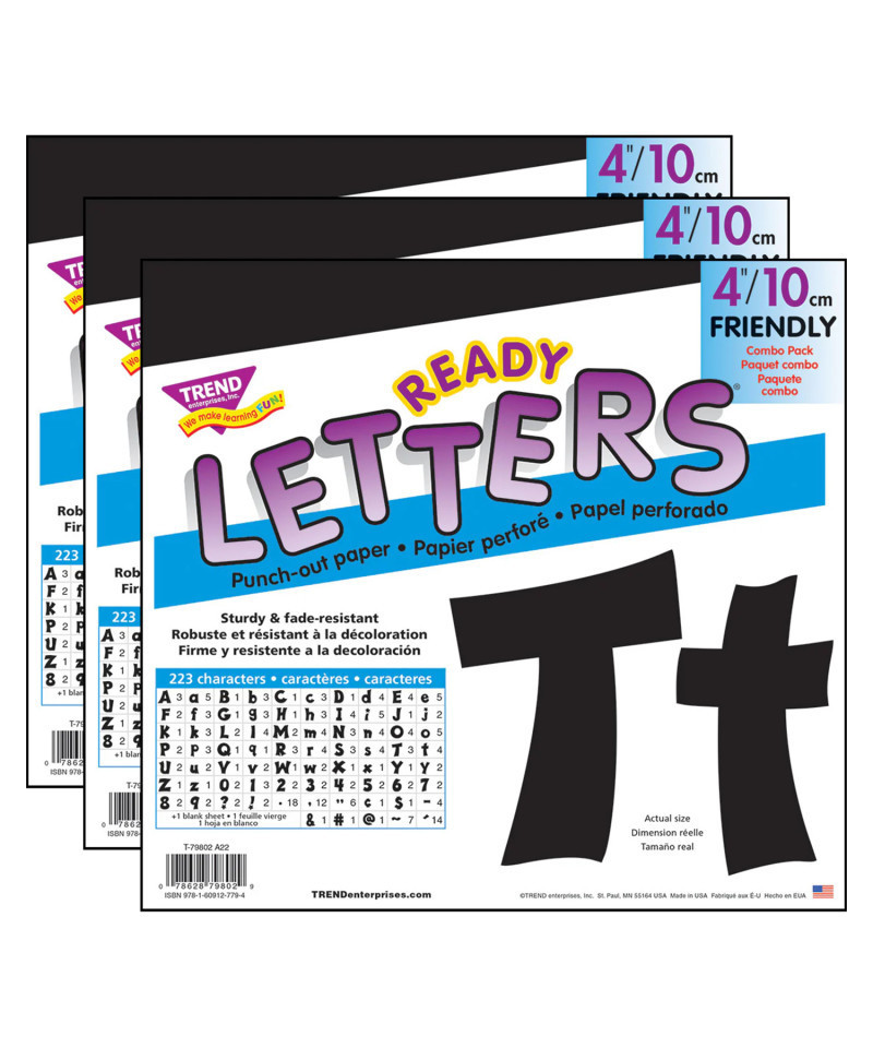 Lively letters, limitless possibilities! Convenient, reusable, and easy to use. Great for student work displays, bulletin boards, signs, banners, news boards, learning activities, labeling, and much more! Fade-resistant colors coordinate with TREND products. Durable. Each pack includes 50 uppercase letters, 82 lowercase letters, 21 numerals 0-9, 44 punctuation marks, 28 Spanish accent marks, and 1 blank sheet. Sold as 3 packs.
