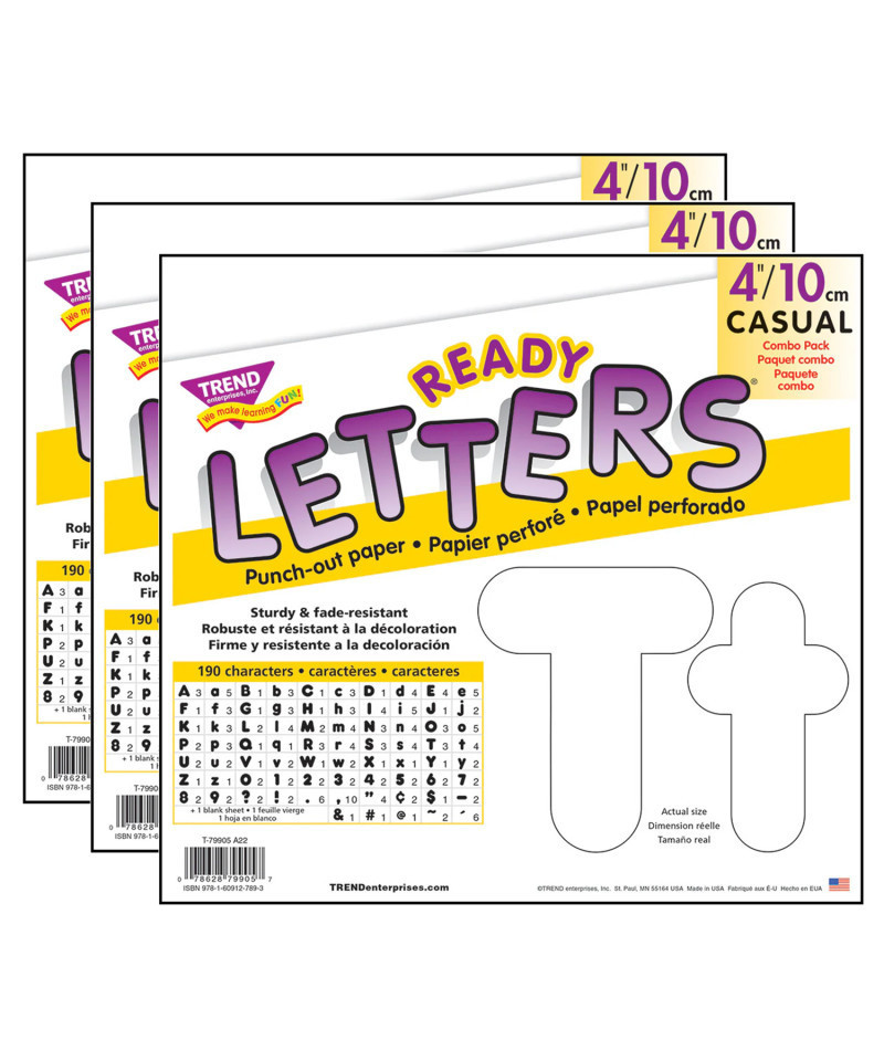 Lively letters with limitless possibilities! Convenient, reusable, and easy to use. Ready Letters are great for use on bulletin boards, signs, news boards, showcases, student work displays, alphabet learning activities, banners, labels, and more. Fade-resistant colors. Durable and reusable. Each pack includes 50 uppercase letters, 82 lowercase letters, 20 numerals 0-9, 29 punctuation marks, and 1 blank sheet. Sold as 3 packs.