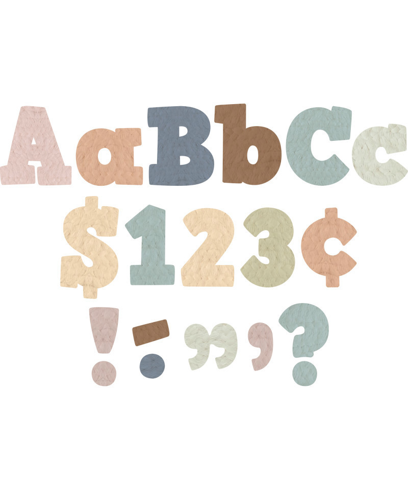 Use these 4" letters to create bulletin boards, classroom centers, signs, banners, and other displays. They punch out easily and are coated for durability. The colors and designs coordinate with popular decorative products from Teacher Created Resources. Each pack includes 230 total pieces: 156 letters, 20 numbers 0-9, 40 punctuation marks and 14 Spanish accent marks.