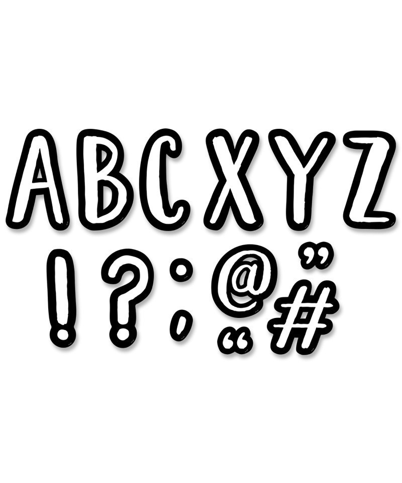 Create big, eye-catching headlines with Café 7" Designer Letters! These script-style punch-out letters are white in the center with a thick black edging, making them highly visible from a distance. This package includes 120 pieces—uppercase letters, punctuation marks, and symbols. The casual, modern design of these punch-out letters makes them versatile for use on any bulletin board or display in a school, office, college dorm, senior living residence, church, or daycare center. Great for party signs, hallways, and other large spaces.