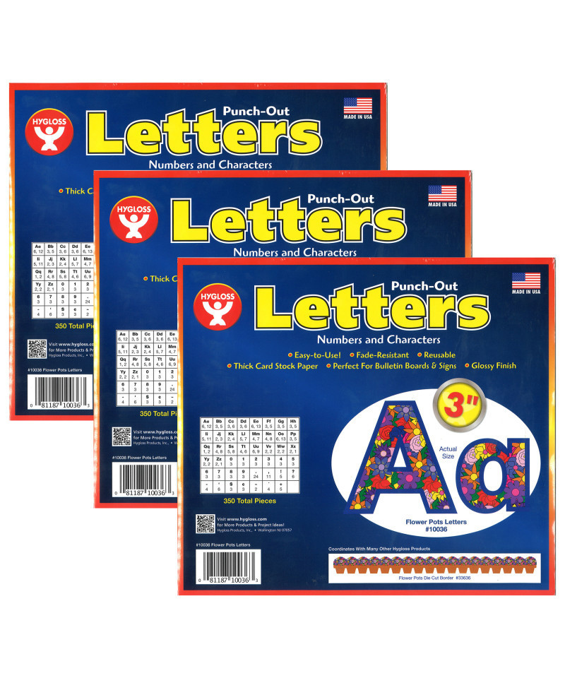 Hygloss Flower Pots Punch-Out Letters make it simple to decorate your bulletin board or classroom with amazing results. These letters and characters measure 3 inches tall. Printed on premium quality card stock. Each pack includes 350 characters. Sold as 3 packs for a total of 1080 characters.