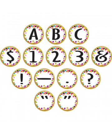 An easy way to create personalized classroom messages on bulletin boards, windows, chalkboards and hallways. Set includes 178 pieces, including uppercase letters, numerals, punctuation marks, and symbols. Individual letters measure 3.8". Brilliant, rich colors printed on long lasting coated paper. Reusable.