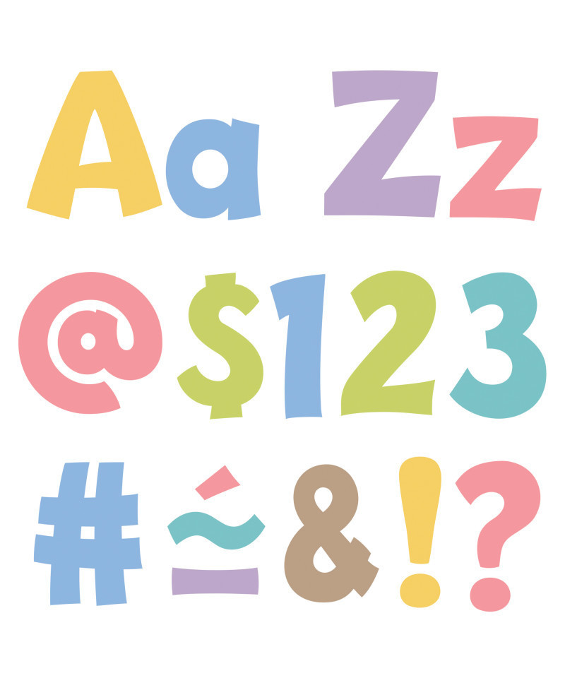 Lively letters ... limitless possibilities! Convenient, reusable, and easy to use! Great for student work displays, bulletin boards, signs, banners, news boards, learning activities, labeling, and much more! Fade-resistant colors coordinate with TREND products. Durable and reusable. Includes 59 uppercase letters, 84 lowercase letters, 20 numerals 0-9, 35 punctuation marks, and 18 Spanish accent marks.