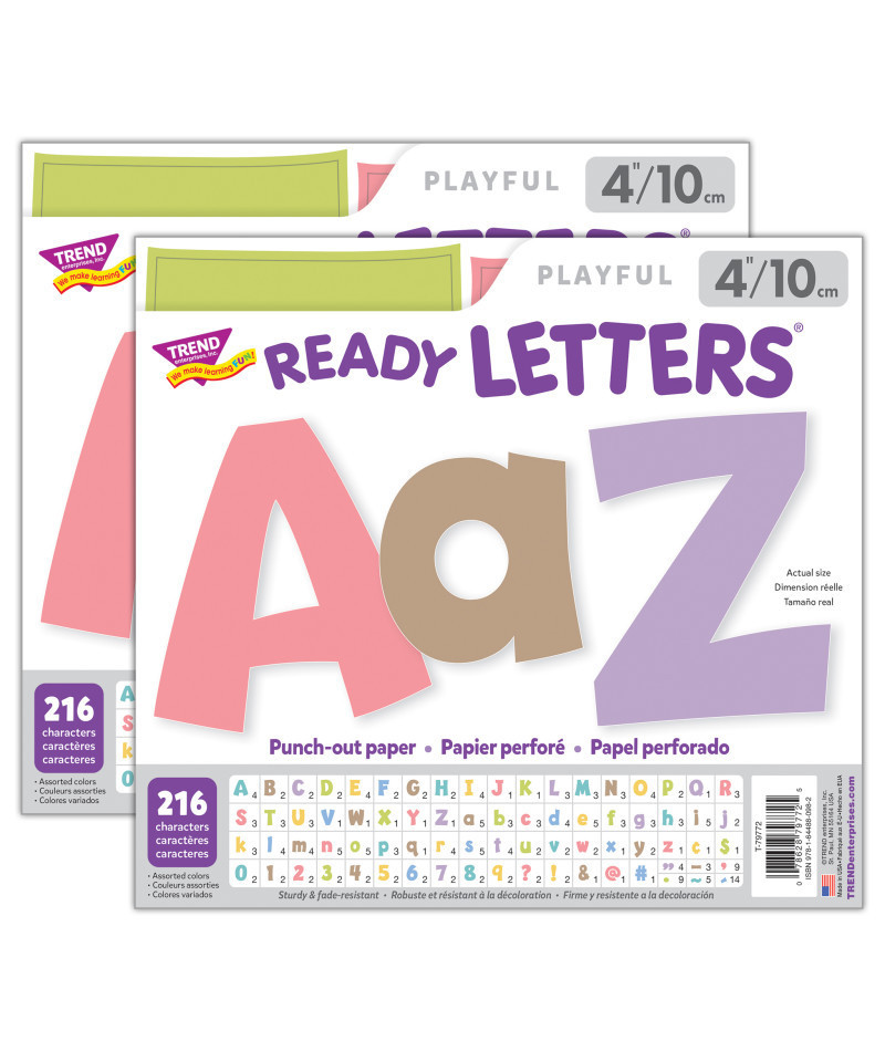 Lively letters ... limitless possibilities! Convenient, reusable, and easy to use! Great for student work displays, bulletin boards, signs, banners, news boards, learning activities, labeling, and much more! Fade-resistant colors coordinate with TREND products. Durable and reusable. Each pack includes 216 pieces: 59 uppercase letters, 84 lowercase letters, 20 numerals 0-9, 35 punctuation marks, and 18 Spanish accent marks. Sold as 2 packs for a total of 432 pieces.